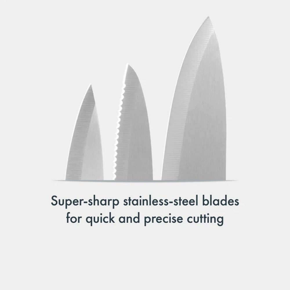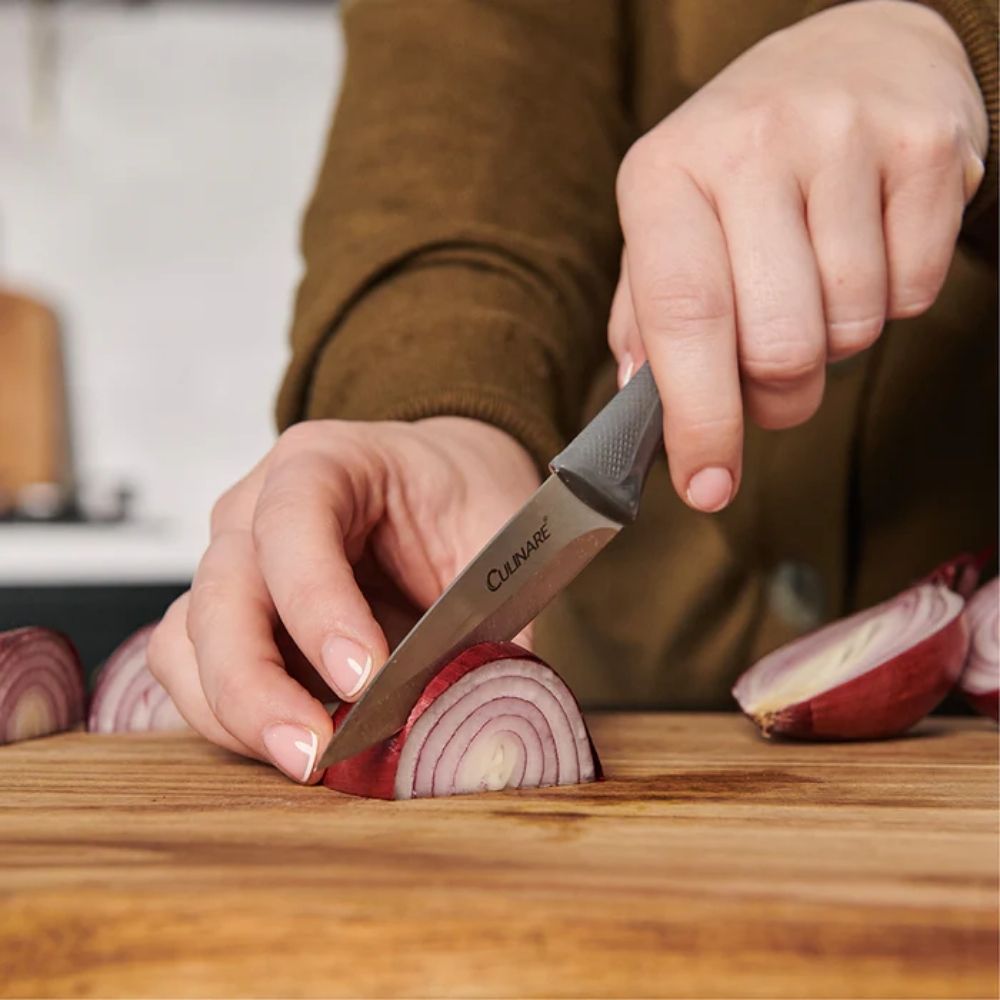 The Culinare 3-Piece Knife Set includes a 9?cm paring knife, 10?cm serrated paring knife, and 14?cm utility knife, all with super-sharp stainless-steel blades and ergonomic soft-grip handles. Ideal for precise cutting of fruits, vegetables, cheese, and meat. Dishwasher safe.