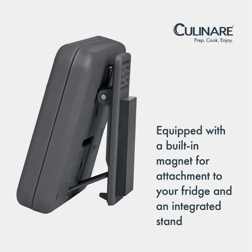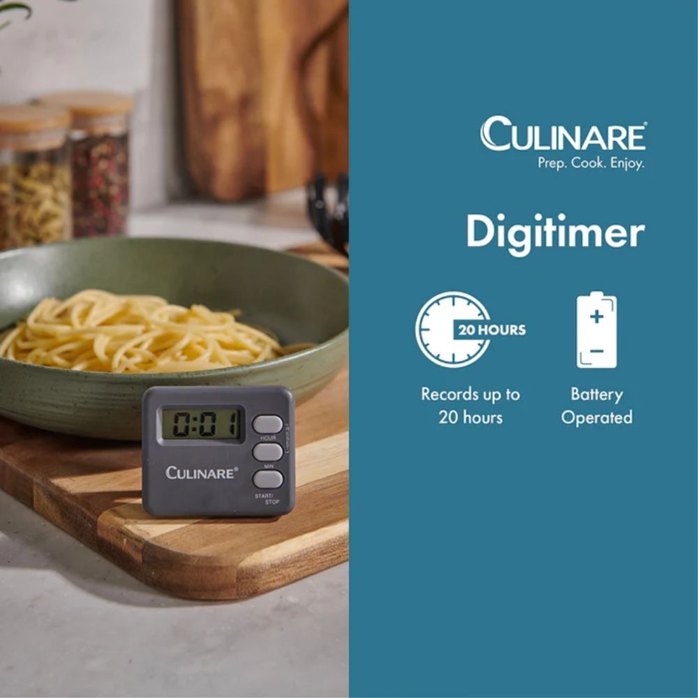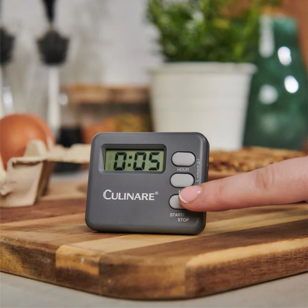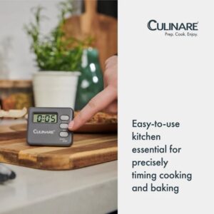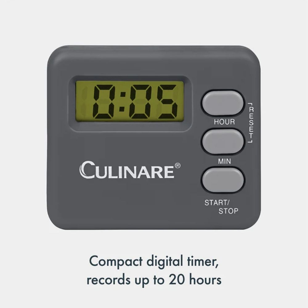 The Culinare 20-Hour Digital Timer is a compact, easy-to-use timer for precise cooking and baking. It records up to 20 hours, features a built-in magnet and stand for versatile placement, and comes with a ready-to-use LR44 battery. Wipe clean; not dishwasher safe.
