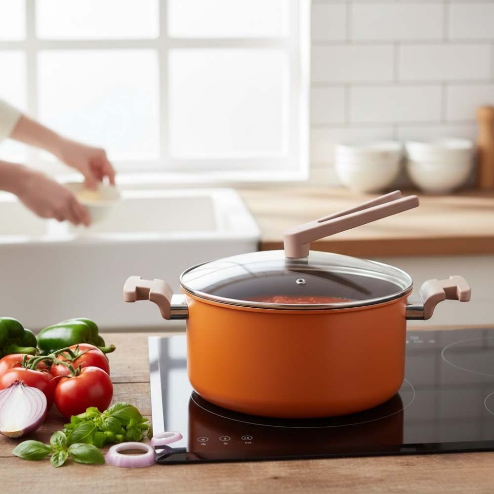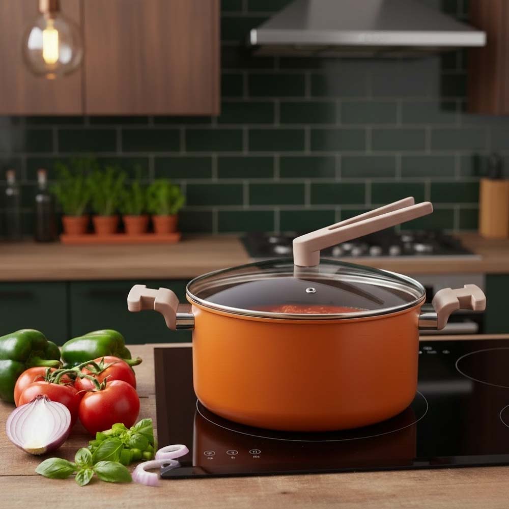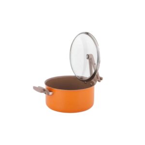 This vibrant orange aluminium nonstick ceramic casserole by Safico Pro combines durability with modern design for efficient and stylish cooking. With a generous 5.3L capacity and Ø24x12cm size, it is perfect for preparing stews, soups, and large family meals. The induction-compatible base ensures even heat distribution, while the standable handle provides safe and convenient placement during cooking.