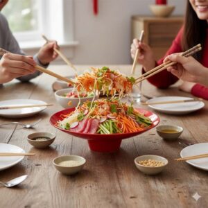 - Vibrant red sashimi plate with stand creates an eye-catching presentation.